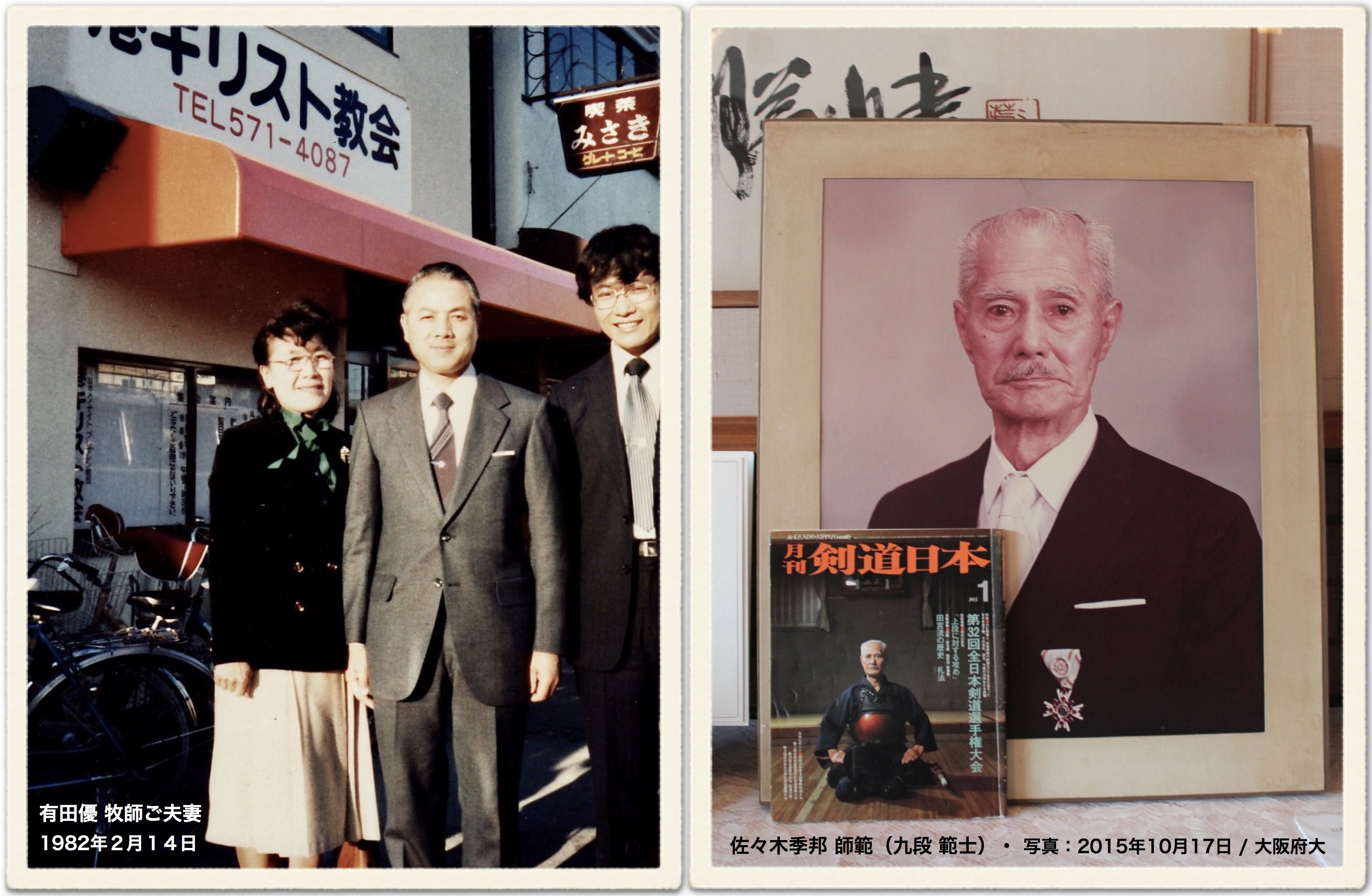 右:大阪府立大学剣道部の「佐々木季邦先生ご夫妻を偲ぶ会」(2015年10月17日)で展示された、佐々木先生の肖像写真と「剣道日本」(1985年1月)の表紙。